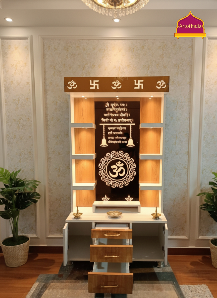 ARTOFINDIA White Brown Wooden Pooja Mandir With Om Glass and Drawers Included Tray