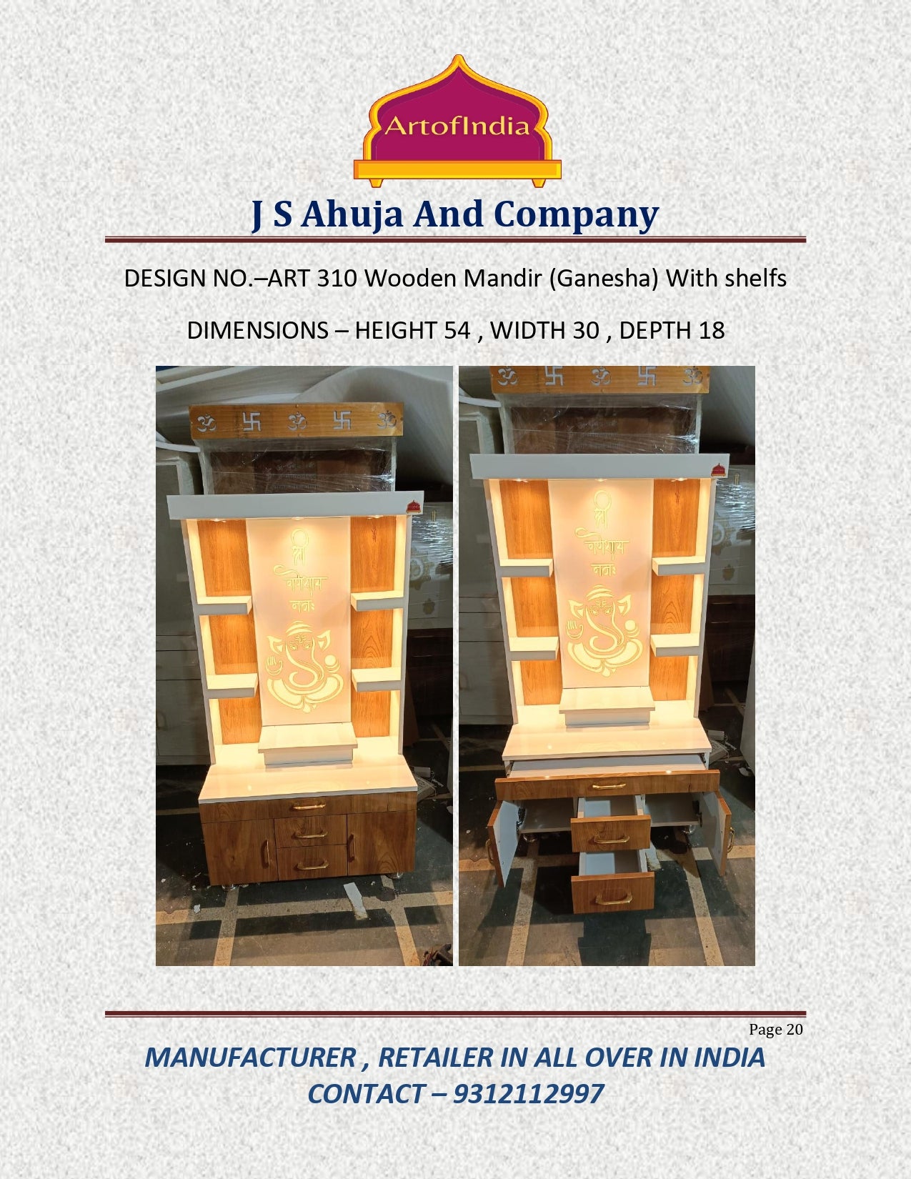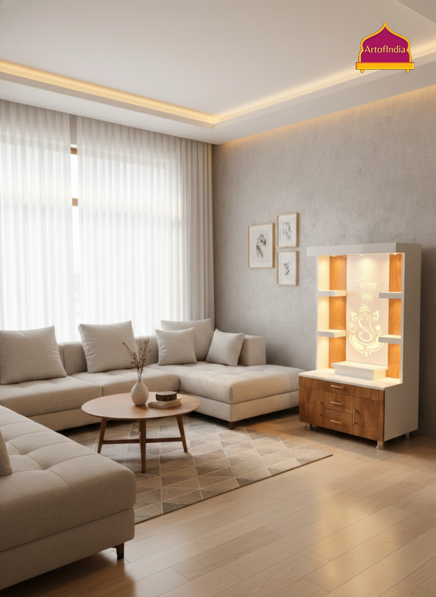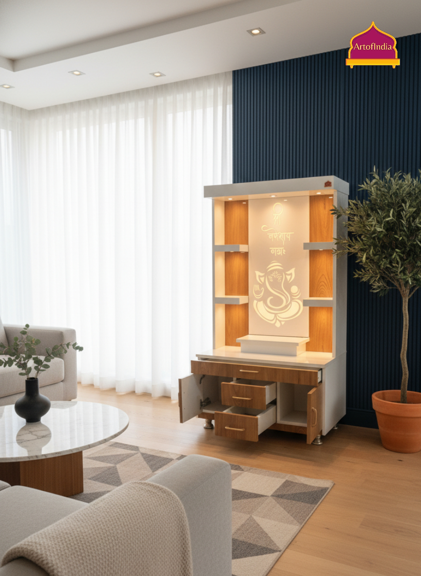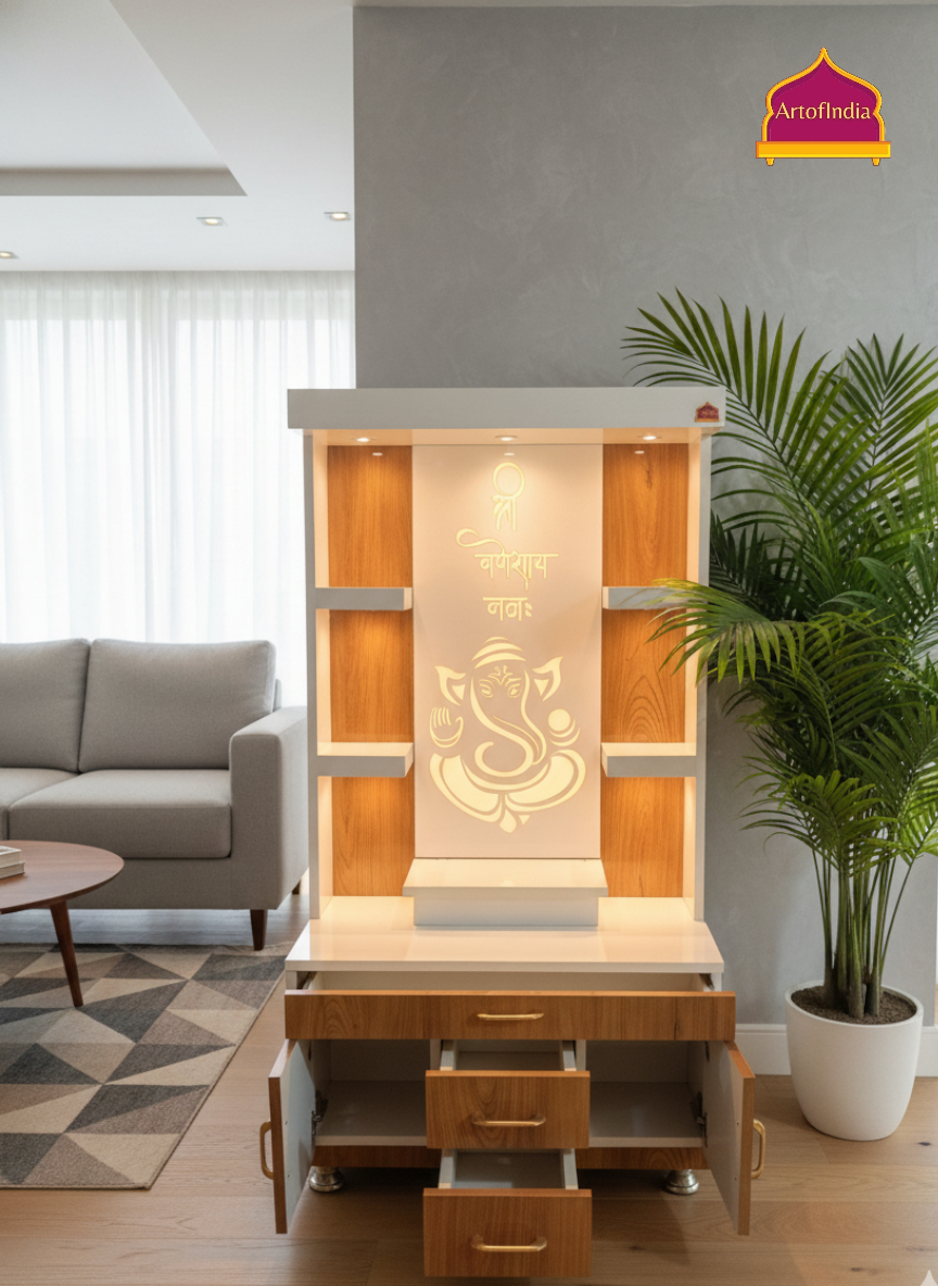 ARTOFINDIA White Wooden Pooja Mandir With Ganesh Design and Drawers Included Tray