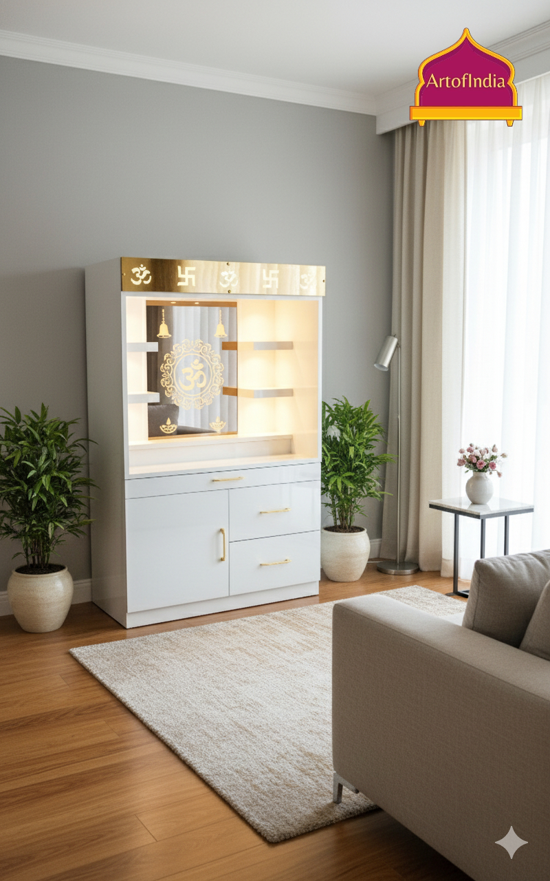 ARTOFINDIA White Wooden Pooja Mandir With Om Glass and drawers & tray