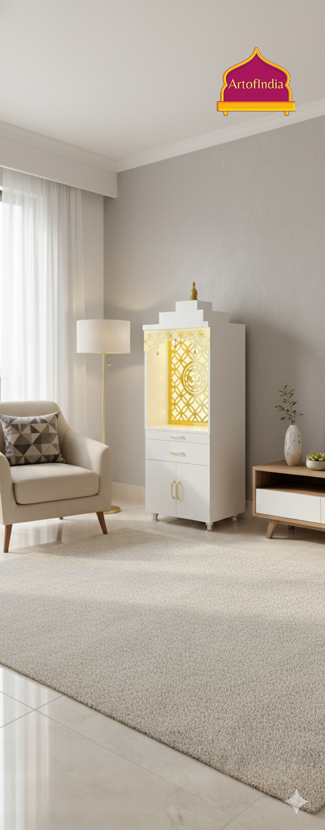 ARTOFINDIA White Wooden Pooja Mandir With Gumbad & Om jali with Mehrab jali and drawers &tray