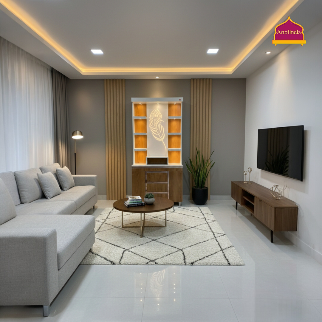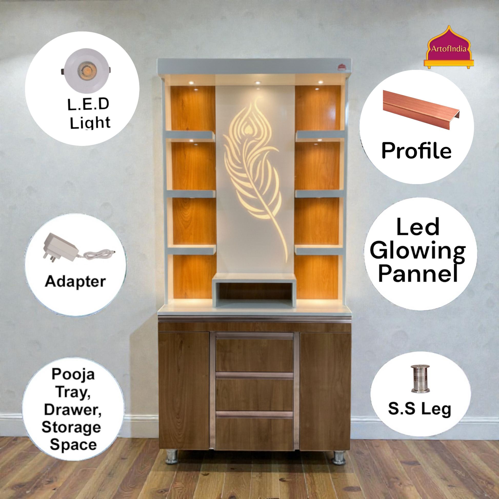 ARTOFINDIA White Wooden Pooja Mandir With Jain Glass And Doors With Drawers Included Tray