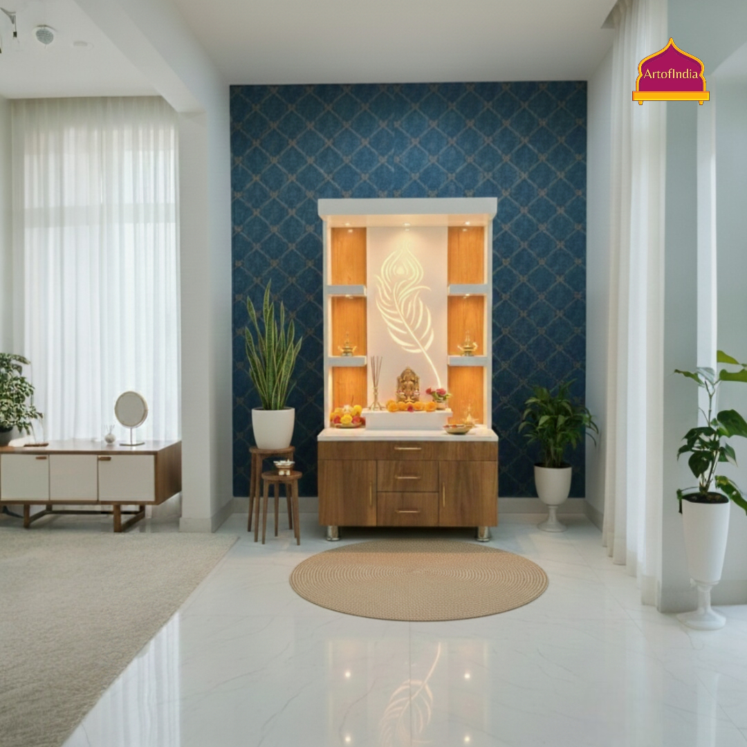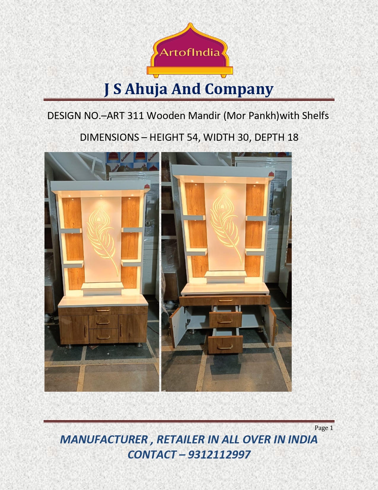 ARTOFINDIA White Wooden Pooja Mandir With Mor Pankh Design Glass and Drawers Included Tray