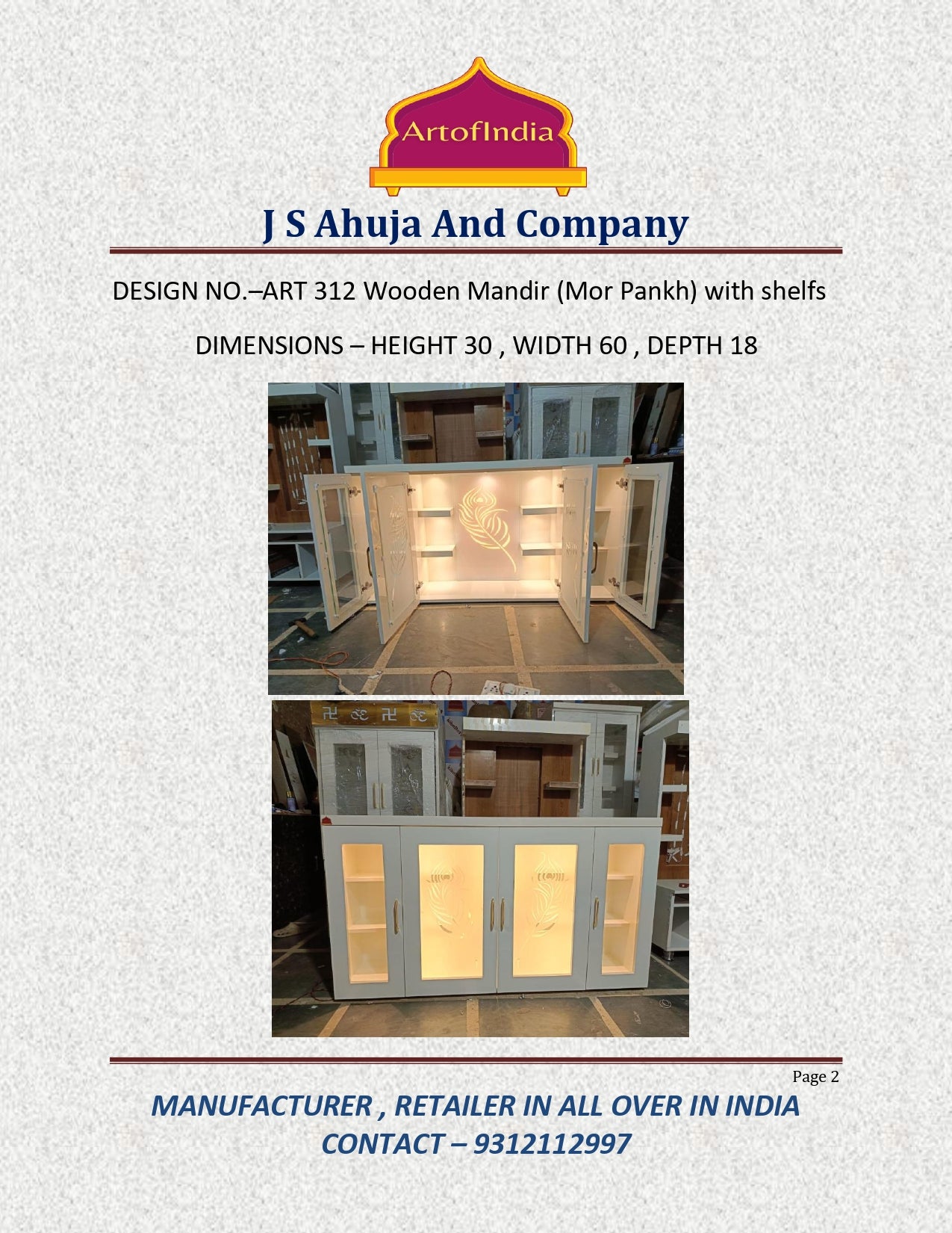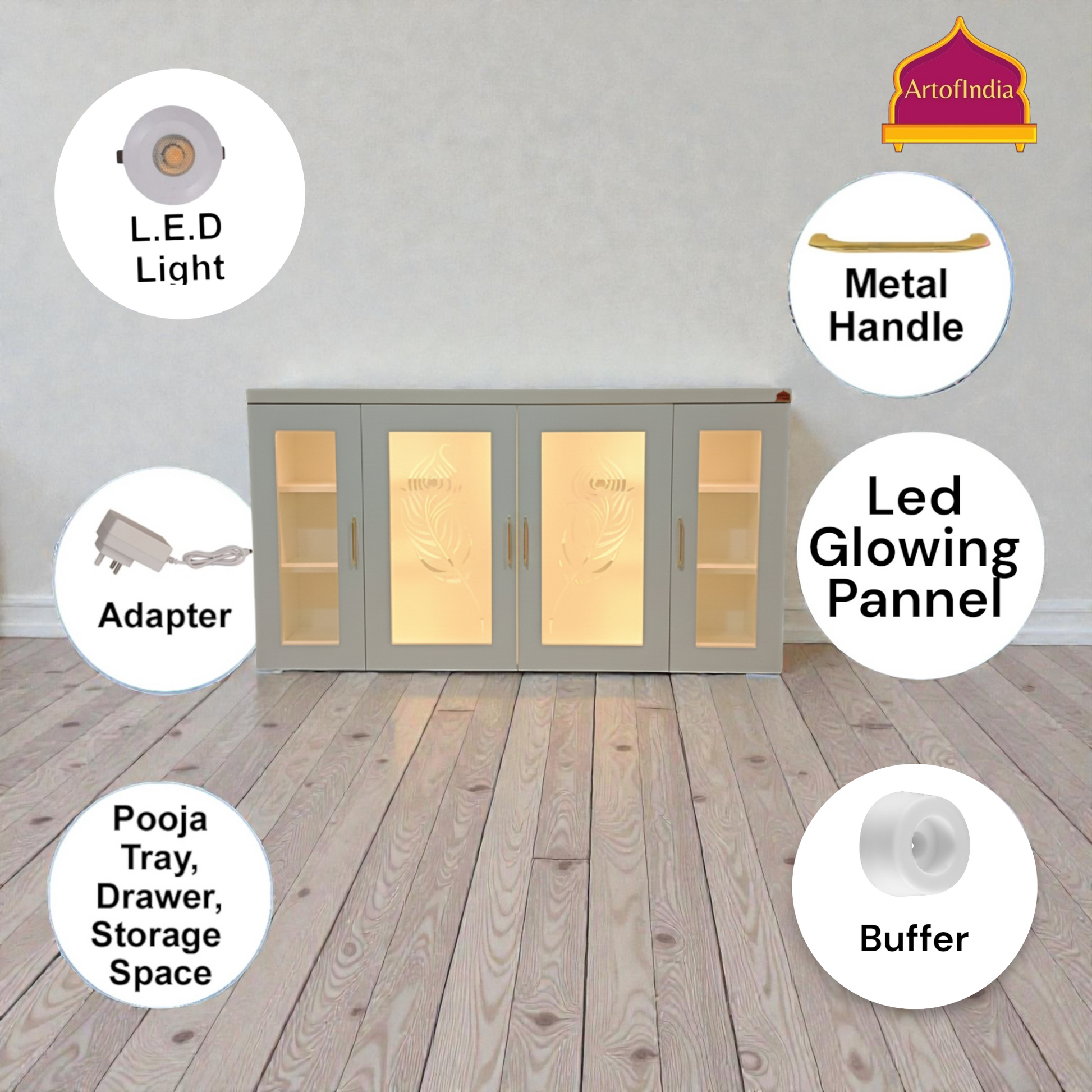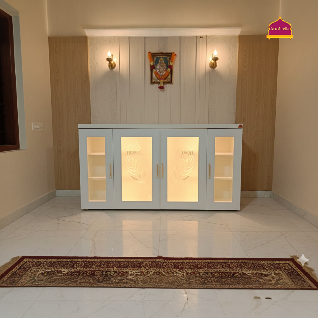 ARTOFINDIA White Wooden Pooja Mandir With Mor Pankh Design Glass and Drawers Included Tray
