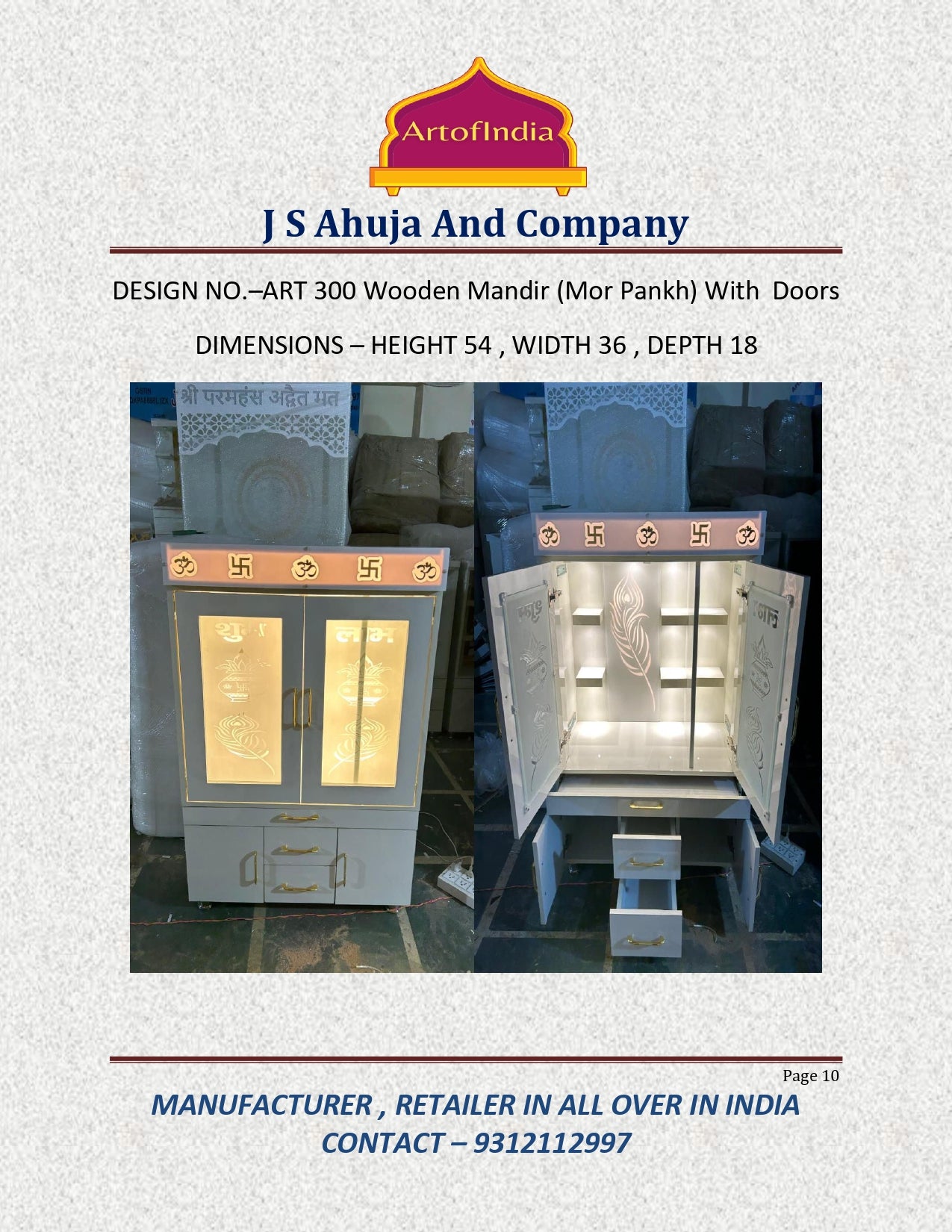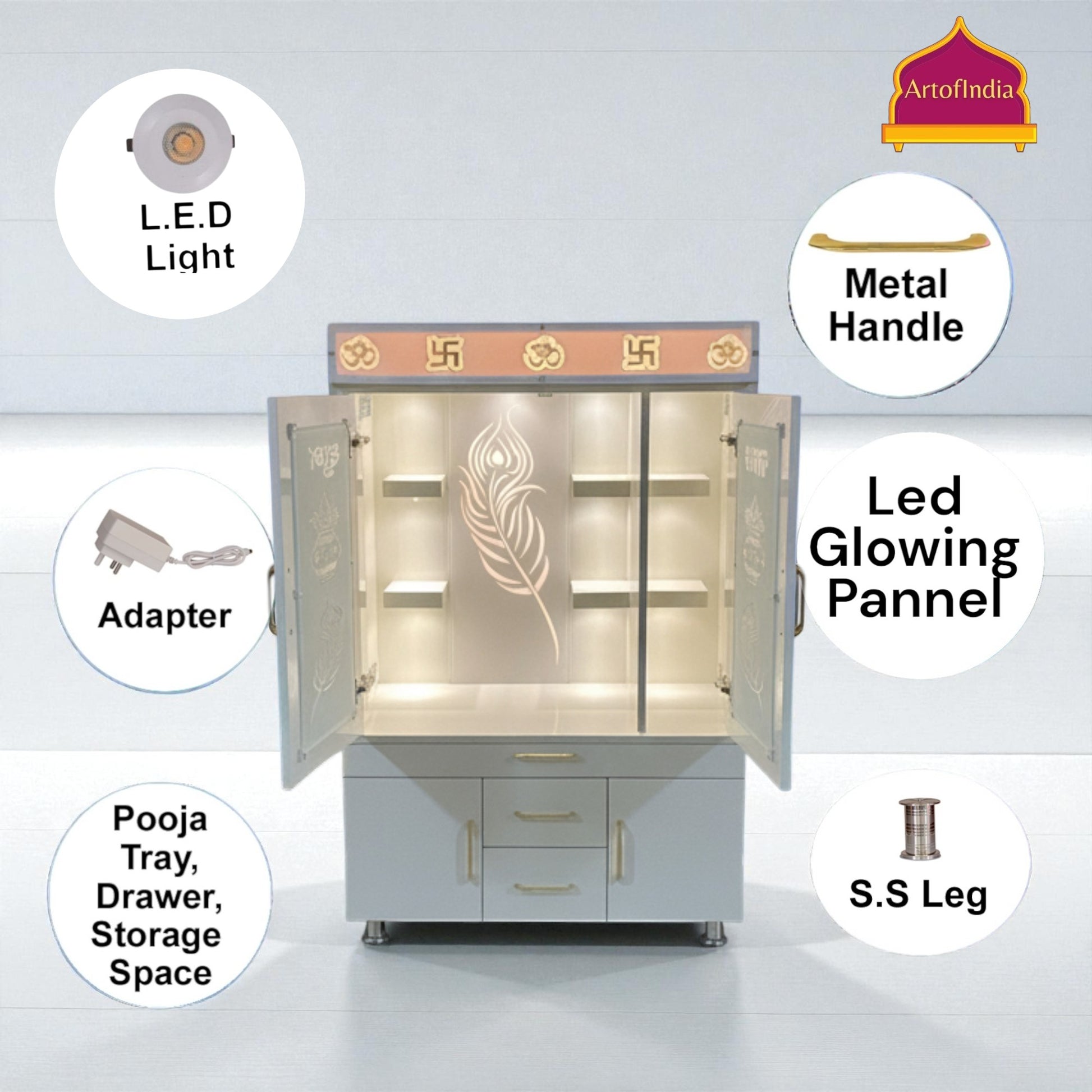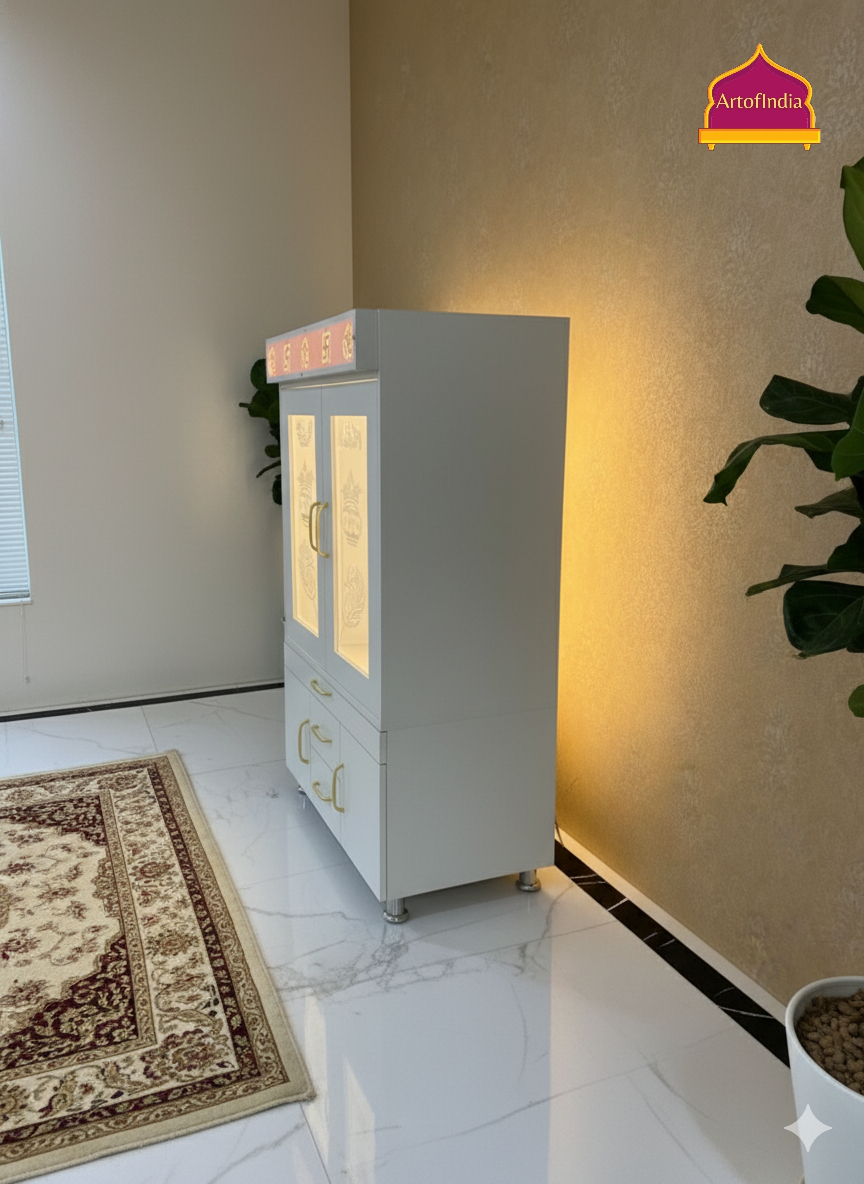 ARTOFINDIA White Wooden Pooja Mandir With Mor Pankh Glass & and Drawers Included Tray