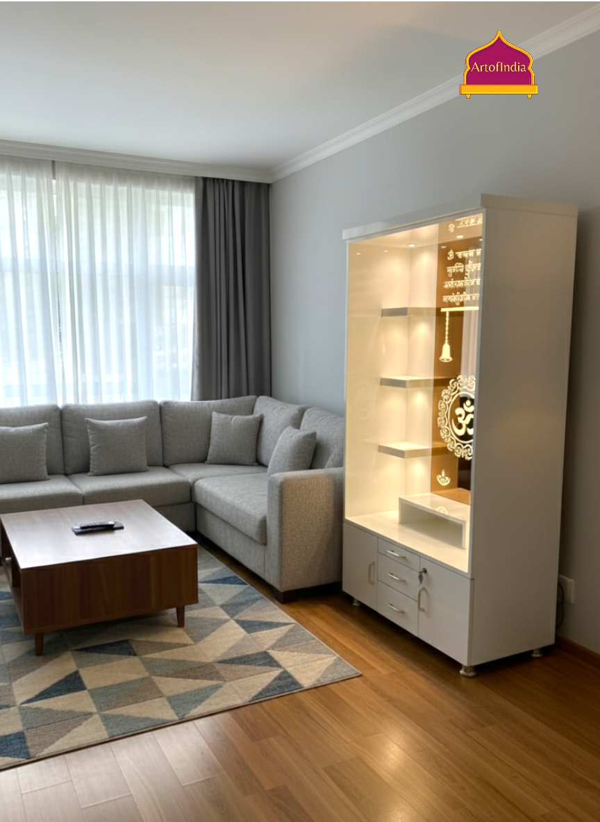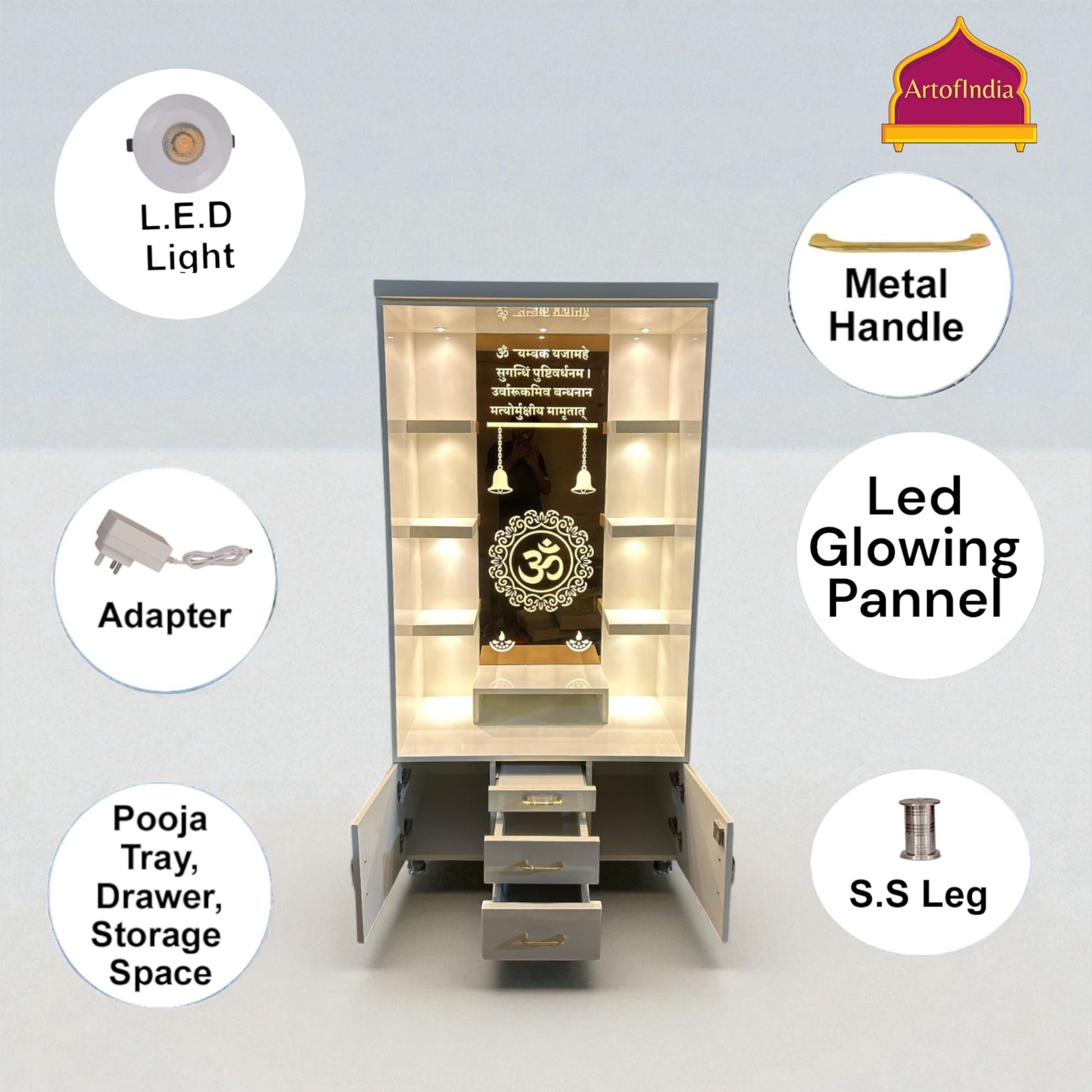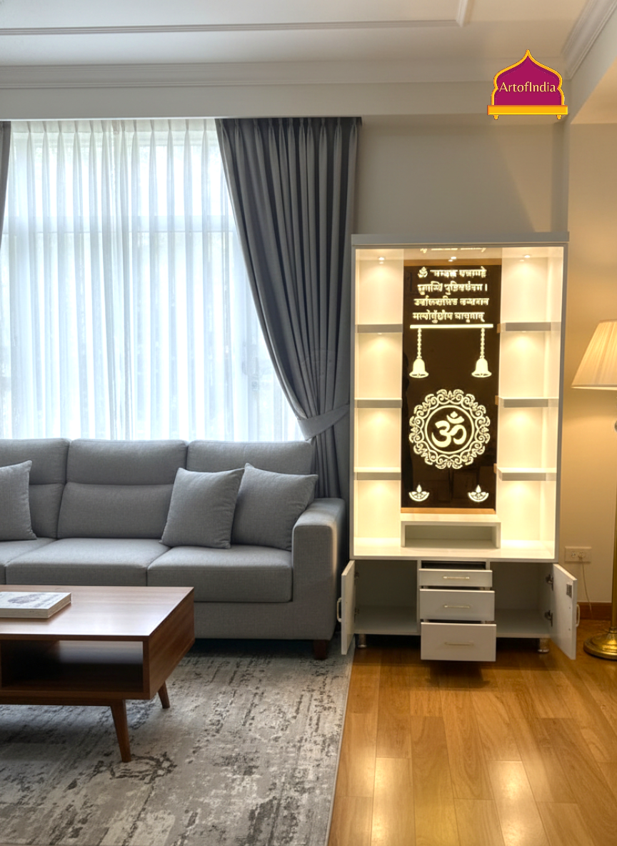 ARTOFINDIA White Wooden Pooja Mandir With Om Glass & and Drawers Included Tray