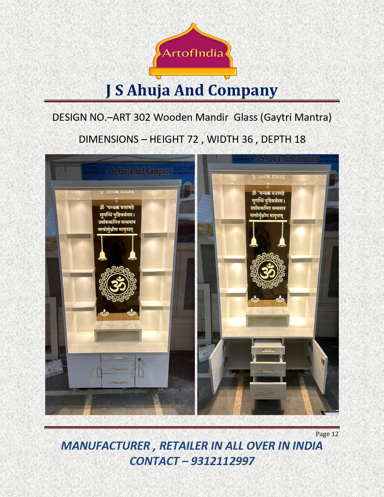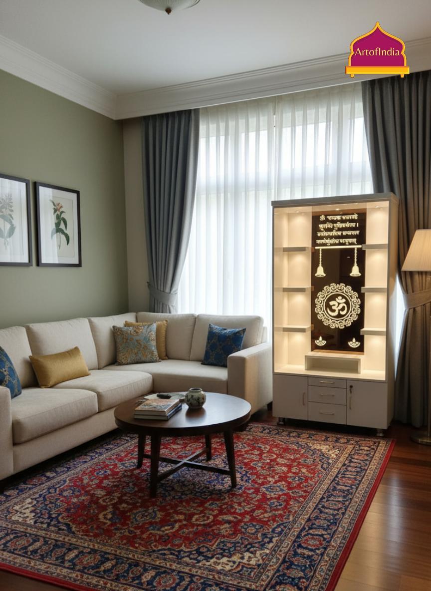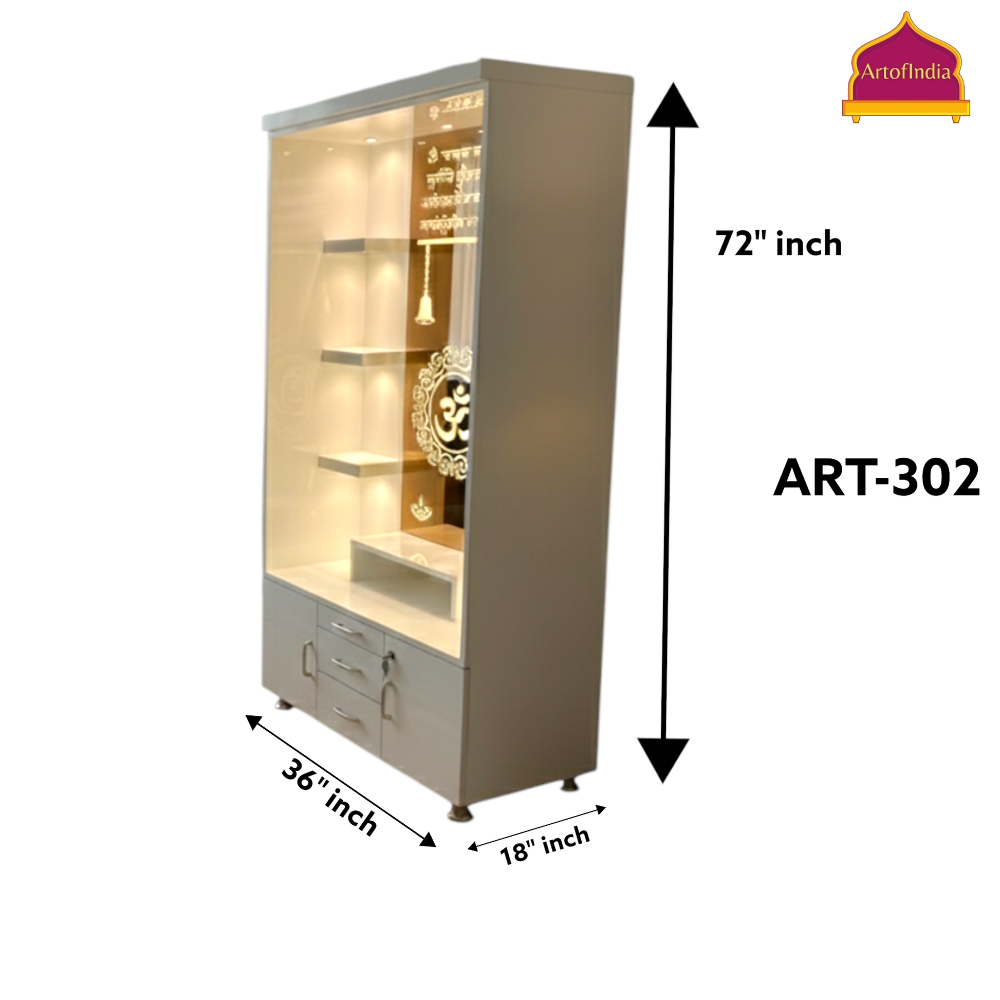 ARTOFINDIA White Wooden Pooja Mandir With Om Glass & and Drawers Included Tray