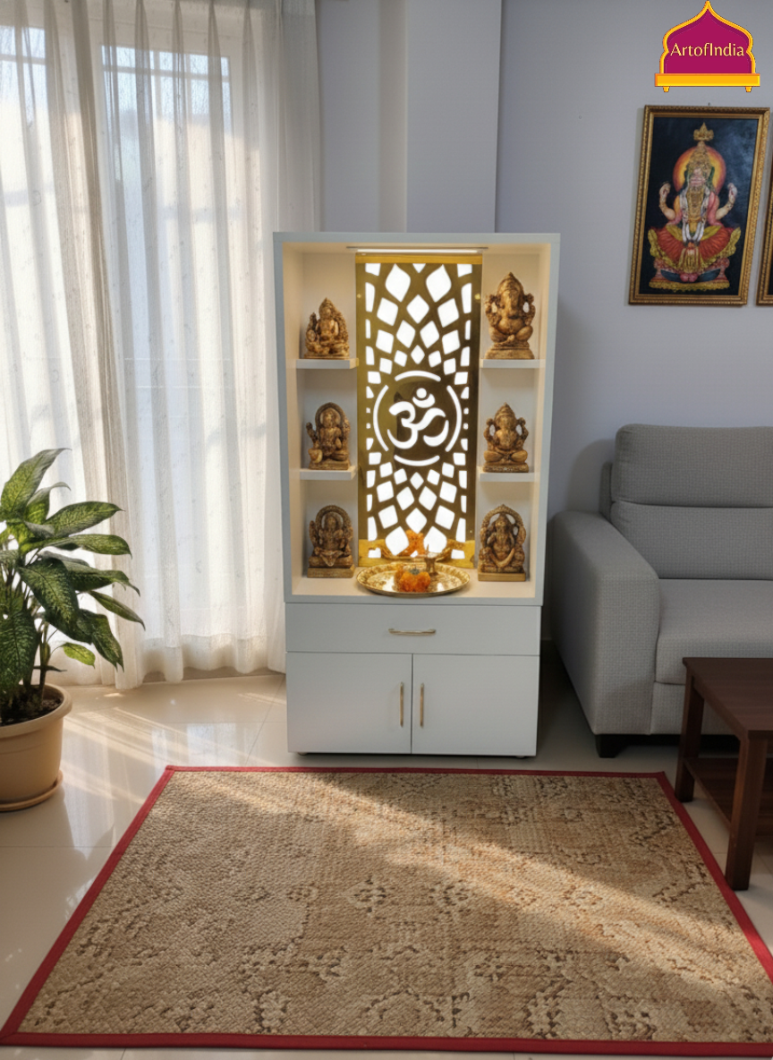 ARTOFINDIA White Wooden Pooja Mandir With Om Jali With Drawers Including Tray