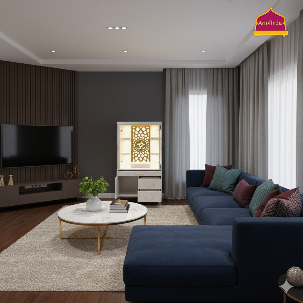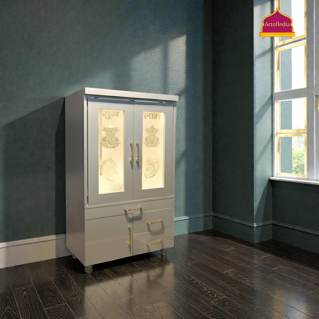 ARTOFINDIA White Wooden Pooja Mandir With jali Doors & Om Jali and Drawers Included Tray